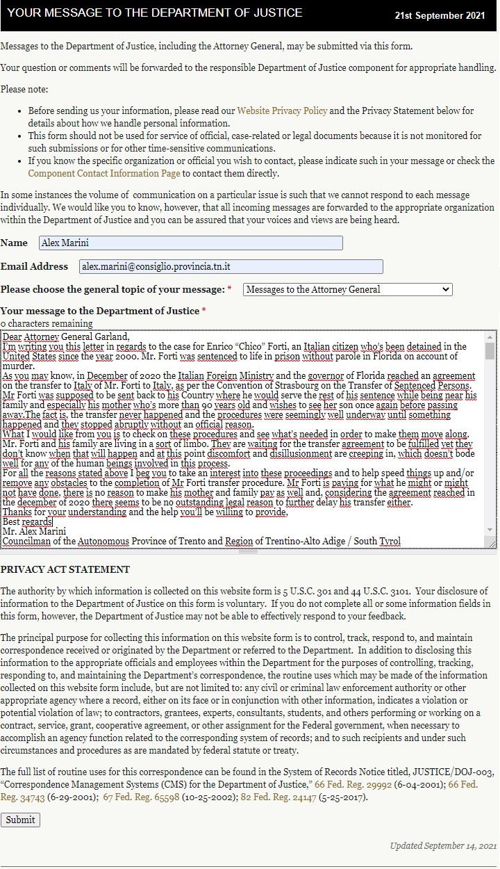 21 novembre 2021 – Lettera all’Attorney General Merrick Garland