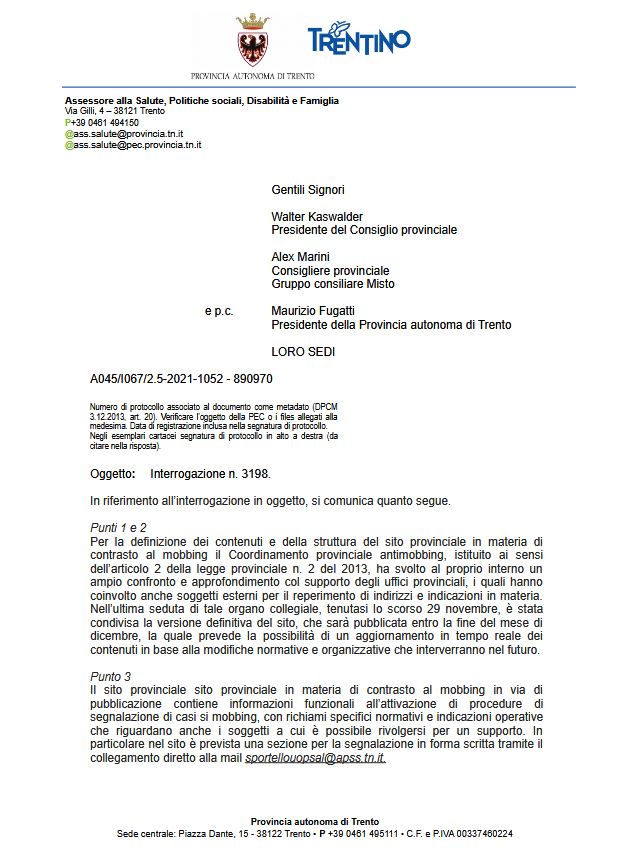 in data 27 ottobre 2021, la dirigente dell’Umse Sviluppo Rete dei Servizi rispondeva all’istanza di accesso agli atti presentata il 13 settembre scorso dall’interrogante, fornendo le relazioni sull’attività svolta dal Coordinamento provinciale antimobbing relative ai seguenti periodi: (1) da 3 novembre 2017 a 11 dicembre 2018; (2) da 11 novembre 2019 a 30 settembre 2021 (in allegato);