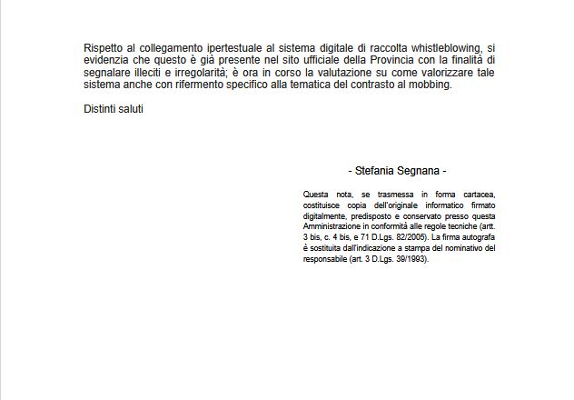 - se, nel sito internet in via di predisposizione, non ritenga di fornire indicazioni utili a coloro che intendono segnalare presunti casi di mobbing o di violazione del Codice di Comportamento dei dipendenti della pubblica amministrazione, ad esempio indicando il collegamento ipertestuale al sistema digitale di raccolta whistleblowing