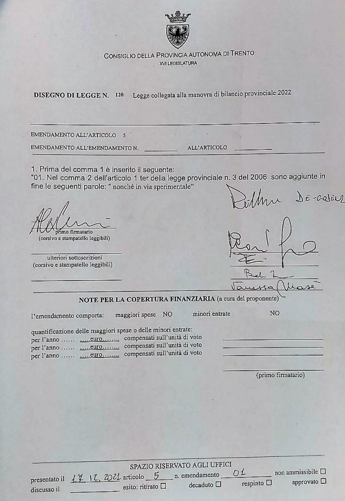 Segue il testo dell’emendamento concordato con la giunta provinciale col quale è stata approvata la proposta di ordine del giorno
