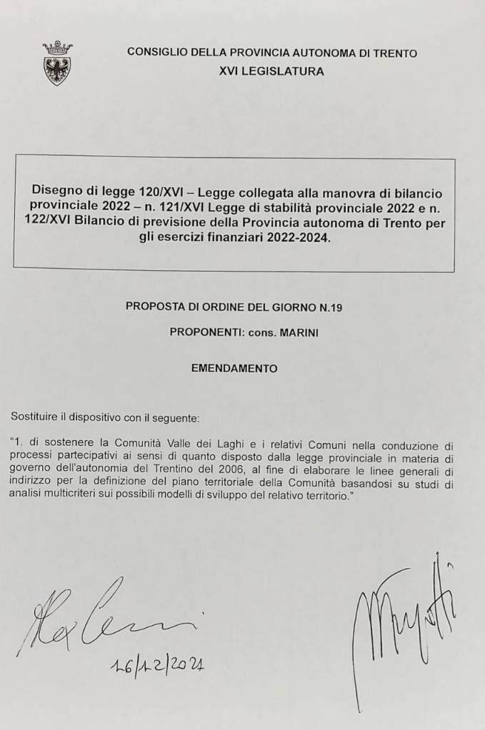 Segue il testo integrale della proposta di ordine del giorno n.19/120-121-122/XVI “Affidamento di uno studio di analisi multicriteri sui possibili modelli di sviluppo del territorio della Valle dei Laghi” collegata ai disegni di legge 8 novembre 2021, n. 120/XVI “Legge collegata alla manovra di bilancio provinciale 2022”, n. 121/XVI “Legge di stabilità provinciale 2022”, n. 122/XVI “Bilancio di previsione della Provincia autonoma di Trento per gli esercizi finanziari 2022-2024” e NADEFP 2022-2024 – Approvata il 15 dicembre 2021 (ORDINE DEL GIORNO 483/XVI)