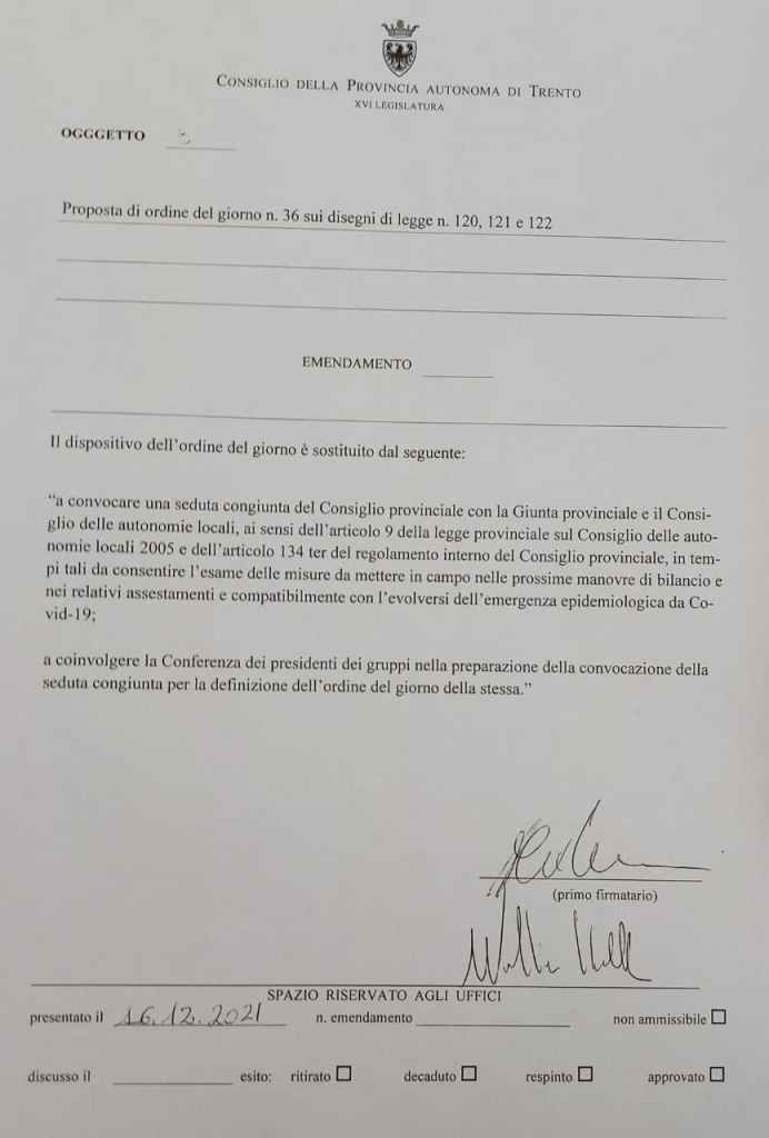 Segue la proposta di ordine del giorno n.36/120-121-122/XVI “Convocazione di una seduta congiunta del Consiglio provinciale con la conferenza permanente per i rapporti tra la Provincia e le autonomie locali” collegata ai disegni di legge 8 novembre 2021, n. 120/XVI “Legge collegata alla manovra di bilancio provinciale 2022”, n. 121/XVI “Legge di stabilità provinciale 2022”, n. 122/XVI “Bilancio di previsione della Provincia autonoma di Trento per gli esercizi finanziari 2022-2024” – Approvata con emendamento al dispositivo il 16 dicembre 2021 (ORDINE DEL GIORNO 455/XVI)