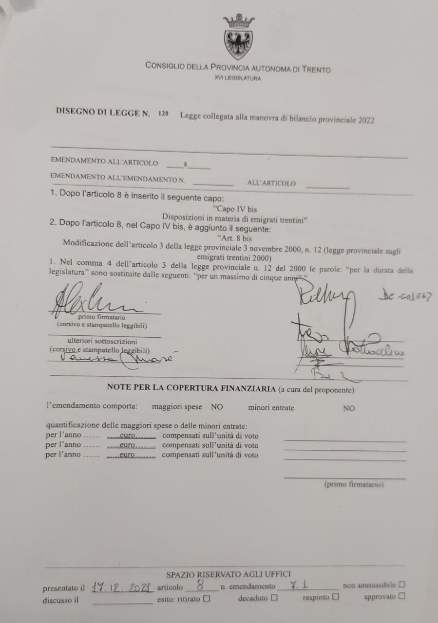 (1) razionalizzazione della durata della nomina dei consultori all’estero aggiornando l’art.3 della legge provinciale sugli emigrati trentini all’estero,
