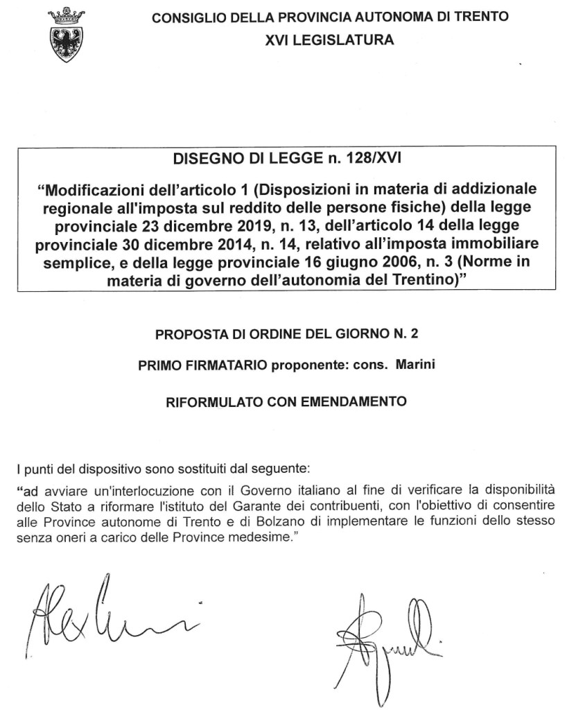 Segue il testo integrale della proposta di ordine del giorno n. 2/128/XVI “Avviare un’interlocuzione con il Governo al fine di riformare l’istituto del garante dei contribuenti con l’obiettivo di consentire alle Province autonome di Trento e Bolzano la possibilità di disciplinare autonomamente l’inquadramento e il funzionamento di tale organo di garanzia” (ordine del giorno 493/XVI) collegata al disegno di legge disegno di legge n. 128/XVI (relazione di minoranza) approvata il 10 marzo 2022 e il relativo emendamento: