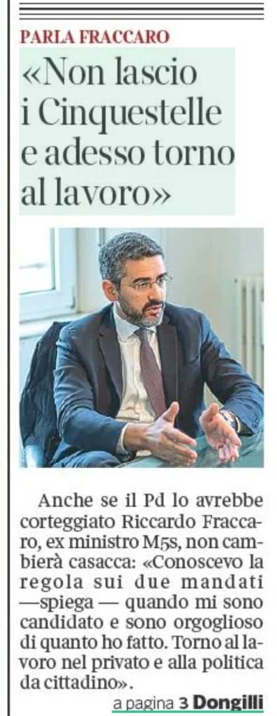 Ringrazio Riccardo Fraccaro per tutto quello che ha fatto in questi anni e per la coerenza che dimostra rimanendo fedele al M5S anche di fronte a proposte di candidatura da parte di altre forze politiche.