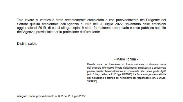 La risposta alla nostra interrogazione è arrivata il 4 agosto. L’assessore competente ci ha riferito che l’aggiornamento dell’inventario è stato acquisito da APPA a fine dicembre 2021 ma che prima di essere formalmente approvato e reso pubblico è tuttavia buona prassi che le molte e complesse informazioni contenute vengano attentamente verificate e controllate. L’assessore ci ha riferito che tale lavoro di verifica è stato recentemente completato e con provvedimento del Dirigente del Settore qualità ambientale dell’Agenzia n. 602 del 20 luglio 2022 l’inventario delle emissioni aggiornato al 2019 è stato formalmente approvato e reso pubblico sul sito dell’Agenzia provinciale per la protezione dell’ambiente.