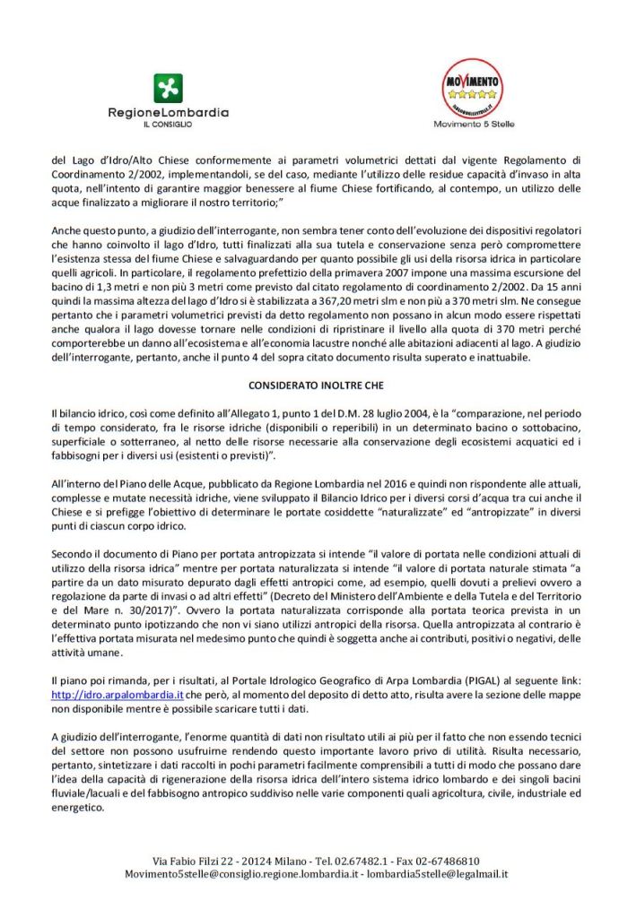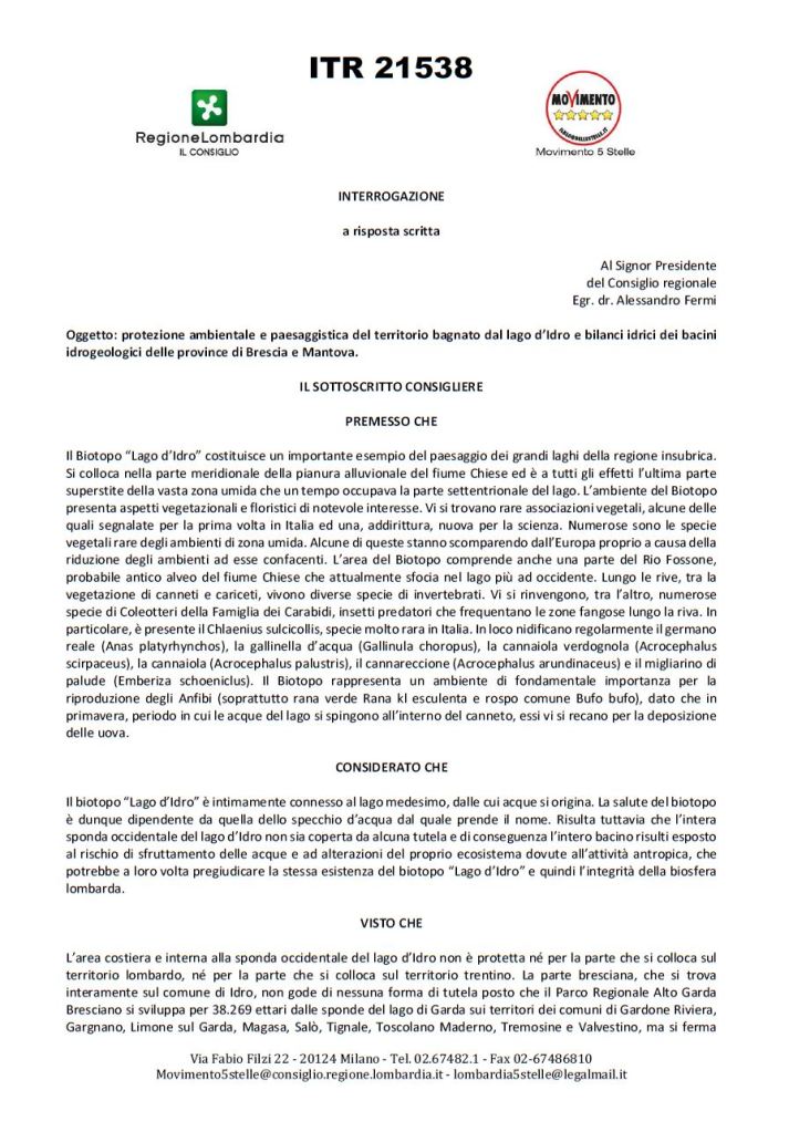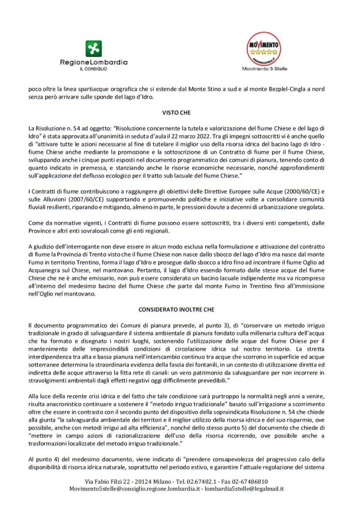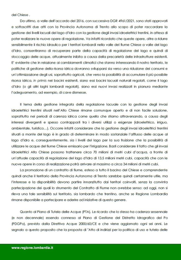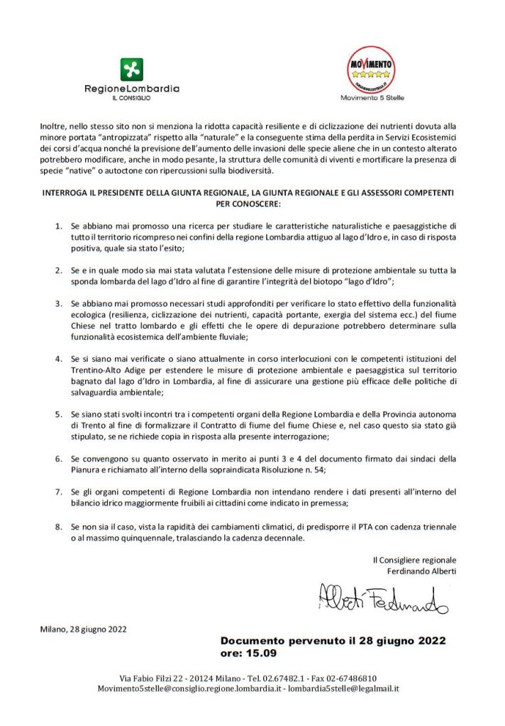 Seguono l’interrogazione n° 21538 del 28 giugno 2022 depositata dal Consigliere Ferdinando Alberti al Consiglio regionale lombardo in merito alla gestione del lago d’Idro e la relativa risposta fornita dall’assessore Pietro Fioroni.
