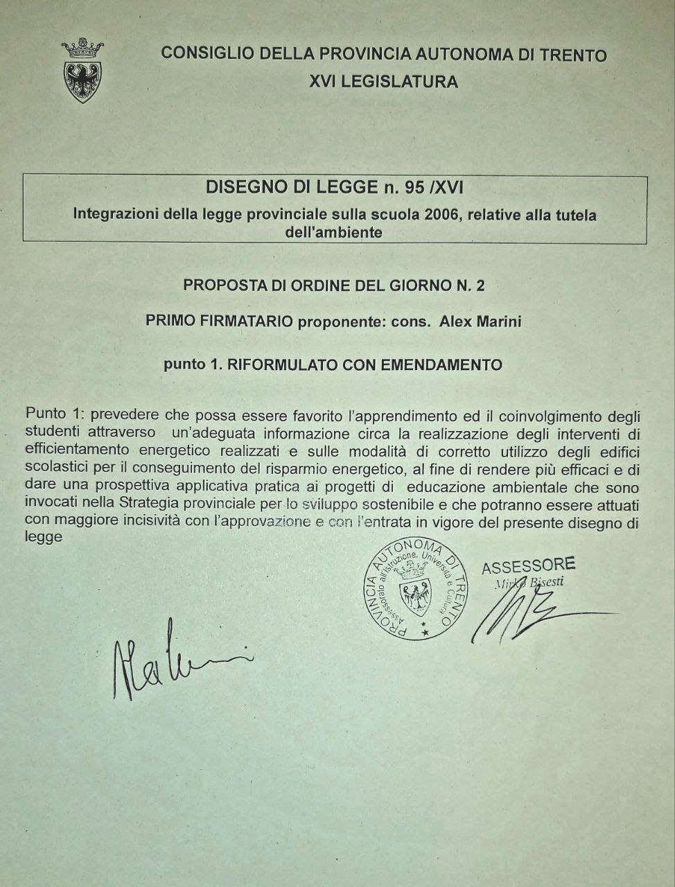 - la proposta di ordine del giorno 2/15-24/XVI del 19 gennaio 2022 “Introdurre il coordinatore ambientale all’interno degli istituti scolastici trentini” con la quale si chiedeva di valutare l’introduzione del coordinatore ambientale all’interno degli istituti scolastici trentini, affidando a tale figura sia funzioni di coordinamento dell’attività educativa, sia di perseguimento degli obiettivi di riduzione e di efficientamento energetico dell’edificio definiti nel bilancio energetico provinciale;