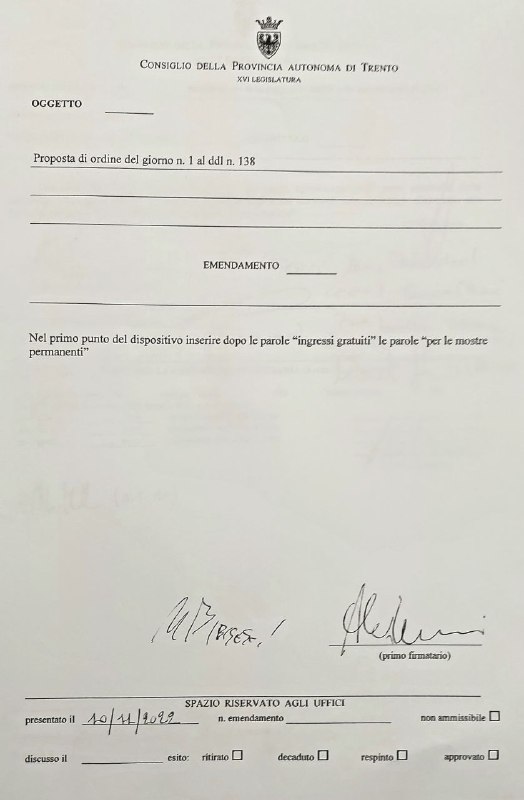 Seguono il video di presentazione e il testo integrale della Proposta di ordine del giorno n.1/138/XVI del 9 novembre 2022 “Introduzione in via sperimentale di ingressi gratuiti al Museo di arte moderna e contemporanea di Trento e Rovereto (MART) per i residenti e coloro che vivono in Trentino” collegata al Disegno di legge n. 138/XVI di iniziativa giuntale “Revisione della disciplina sulle politiche culturali della Provincia: modificazioni della legge provinciale sulle attività culturali 2007 e della legge provinciale 11 novembre 2015, n. 17 (Agevolazioni fiscali in materia di promozione di attività culturali del Trentino, di valorizzazione del patrimonio culturale e del paesaggio trentino)” – Approvata con emendamento concordato con l’assessore Mirko Bisesti il 10 novembre 2022 (convertito nell’ordine del giorno 586/XVI)