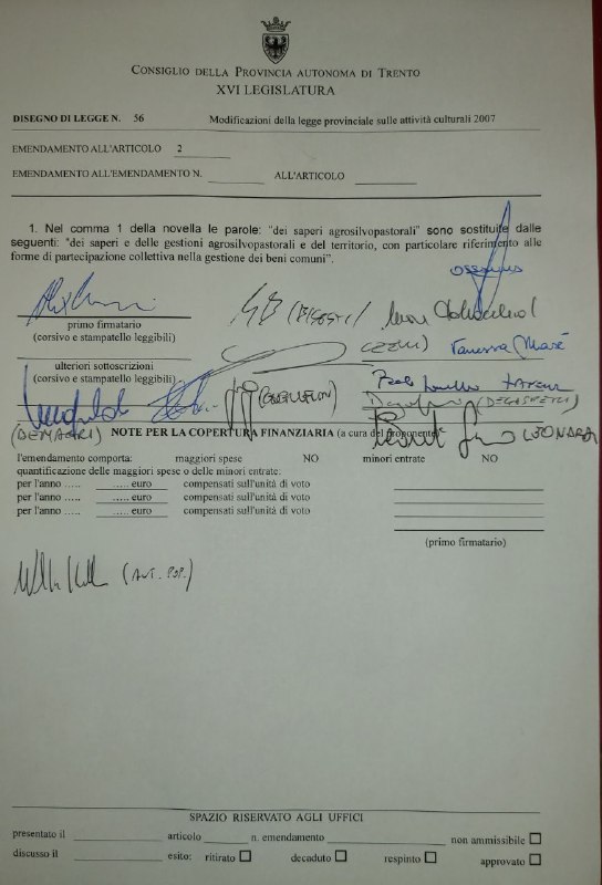 Siccome la nostra proposta è arrivata durante la discussione in Aula e non prima e abbisognava quindi del sostegno delle altre forze politiche per poter essere presa in considerazione, è stato piacevole riscontrare la disponibilità da parte del proponente il disegno di legge e di tutti i capigruppo, compreso il presidente del Consiglio provinciale, a sottoscrivere l’emendamento che è stato susseguentemente inserito nel testo ed approvato con esso.
