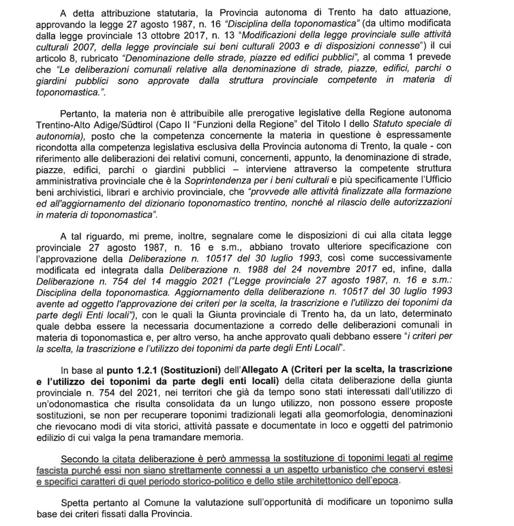 Dalla risposta della Regione risulta chiaro che il Comune di Tione può, se vuole, cambiare il nome di via Italo Balbo a Saone. Non si può dunque continuare a fare il gioco del cerino: se l’amministrazione di Tione ritiene di non riconoscersi nella figura di un gerarca fascista ha tutti gli strumenti per cambiare il nome della via, magari scegliendo un toponimo locale che meglio possa rappresentare la storia di Saone. Detto questo, fa un po’ specie che per avere una risposta siamo dovuti andare a bussare in Regione, visto che alla stessa interrogazione la Provincia di Trento si è ben guardata dal rispondere