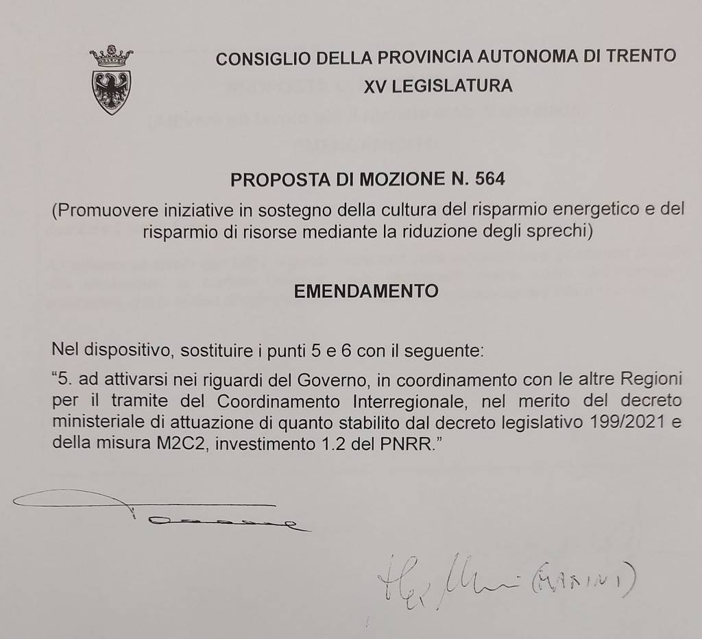La mozione del M5S si articola in una serie di impegni precisi. Nel dettaglio: (1) la Provincia, di concerto con le associazioni del terzo settore, promuove iniziative a sostegno della cultura del risparmio energetico e di risorse, puntando sulla riduzione degli sprechi e la diffusione di stili di vita sostenibili; (2) la Provincia individua e mette a disposizione le risorse necessarie a creare nuove comunità energetiche e di autoconsumo collettivo, anche mettendo a disposizione edifici pubblici e favorendo in primo luogo le famiglie che versano in condizioni di povertà energetica; (3) la Provincia, assieme ad enti pubblici ed imprese impegnati nel settore energetico trentino, mette a disposizione le competenze necessarie a costituire nuove comunità energetiche sul nostro territorio; (4) la Provincia promuove e diffonde la conoscenza di cosa siano e di quali benefici possano portare le comunità energetiche presso la cittadinanza; (5) la Provincia si impegna a fare pressione sul governo nazionale affinché approvi i decreti attuativi che servono a rendere pienamente operative e funzionali le comunità energetiche sul territorio italiano.