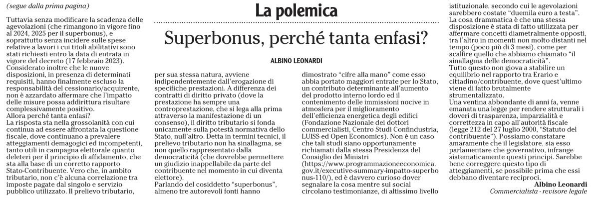 Il governo Meloni ha dato un colpo di mannaia definitivo all’innovativa politica pubblica del SuperEcoBonus 110%. Dal nostro osservatorio provinciale abbiamo ritenuto esprimere delle considerazioni: nel solo Trentino-Alto Adige a gennaio 2023 il numero delle asseverazioni ammontava a 6.831 unità, per un totale di investimenti ammessi a detrazione pari a quasi un miliardo e mezzo di euro e altrettanti come totale di detrazioni previste a fine lavori. Il Superbonus è stato un investimento dell’Italia su tutti i suoi cittadini e si è in gran parte ripagato. Le nostre considerazioni sono state avvalorate anche dall’autorevole parere del commercialista e revisore legale Albino Leonardi pubblicato su L’Adige e sono state riprese dalla testata nazionale Il Dubbio.