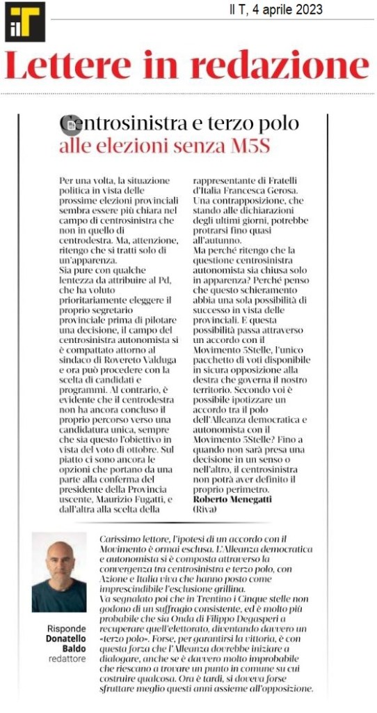Per tutta risposta il redattore Baldo affermava che ogni ipotesi di alleanza col centrosinistra è impercorribile perché i partiti di Renzi e Calenda hanno messo il veto mentre per quanto riguarda il M5S, non prenderebbe voti. Per questo, secondo Baldo, il “terzo polo”, col quale a suo avviso il centrosinistra farebbe bene a confrontarsi, sarebbe eventualmente rappresentato da un signore che pur di garantirsi un terzo mandato ha tradito proprio il M5S trentino, creando il suo partitino personale mentre cercava di distruggere dall’interno il movimento che lo aveva fatto eleggere 2 volte.