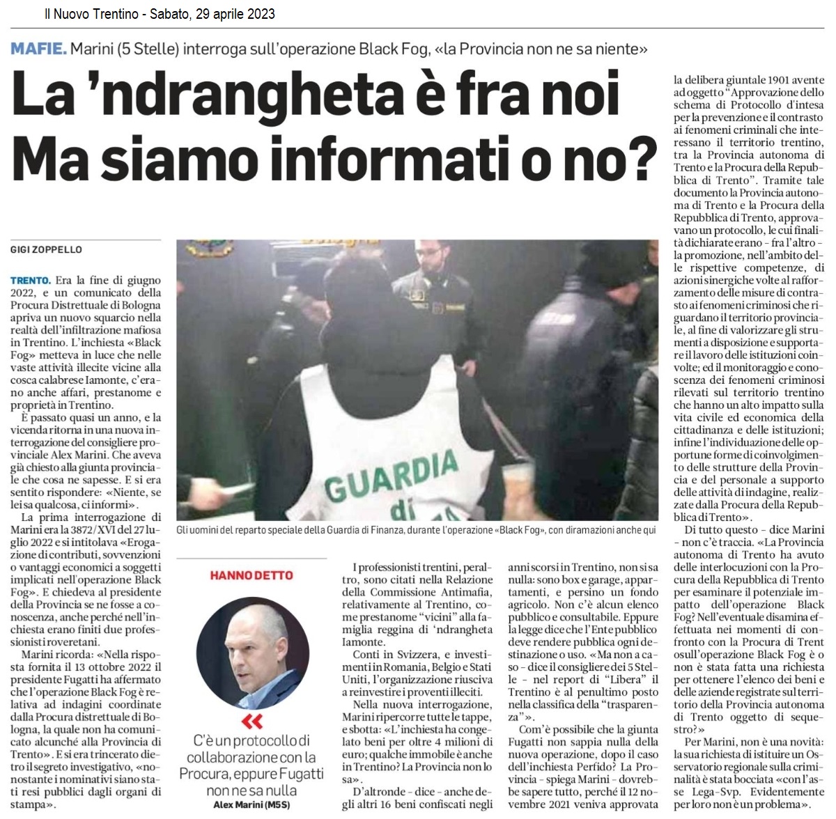 Nel 2022 l’operazione “Black fog” condotta dal nucleo di polizia economico finanziaria di Bologna aveva fatto emergere una rete criminale operante nel bolognese e legata alla cosca ‘ndranghetista degli Iamonte, gli stessi che hanno messo le mani sul porfido in Val di Cembra. Sul tema avevo già interrogato il Presidente Fugatti, per sapere se la Provincia avesse mai erogato contributi ai soggetti implicati nell’operazione Black Fog o alle imprese ad essi riconducibili. Fugatti nella risposta aveva minimizzato la questione, escludendo queste eventualità. Eppure dalla relazione del Ministero dell’Interno si apprende che due professionisti trentini abbiano agito come prestanome per conto dei soggetti implicati nell’operazione Black Fog e che una delle “società schermo” tramite le quali la cosca operava abbia sede in Trentino. Ho quindi presentato una nuova interrogazione (4489/XVI), sperando di fare luce sulla questione. Della questione ne ha parlato anche Il Nuovo Trentino in un servizio di Gigi Zoppello.