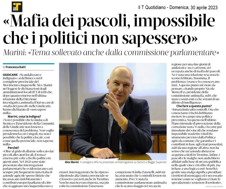 Il tema è quello delle truffe ai fondi dell’UE per il sostegno all’alpeggio e alla monticazione: in pratica società fittizie richiedono i contributi pubblici, ma senza produrre o allevare alcunché. Il caso della “mafia dei pascoli” è emerso nei mesi scorsi con lo smascheramento di alcuni clan messinesi operanti in Abruzzo. Ma pare che anche il Trentino sia stato toccato dal problema, in particolare nelle Giudicarie. Ho quindi presentato un’interrogazione (4488/XVI), che è stata ripresa anche da Il T quotidiano e da L’Adige. Sulla questione sono stato anche intervistato dalla giornalista del quotidiano Il T Francesca Dalrì (testo dell’intervista qui).