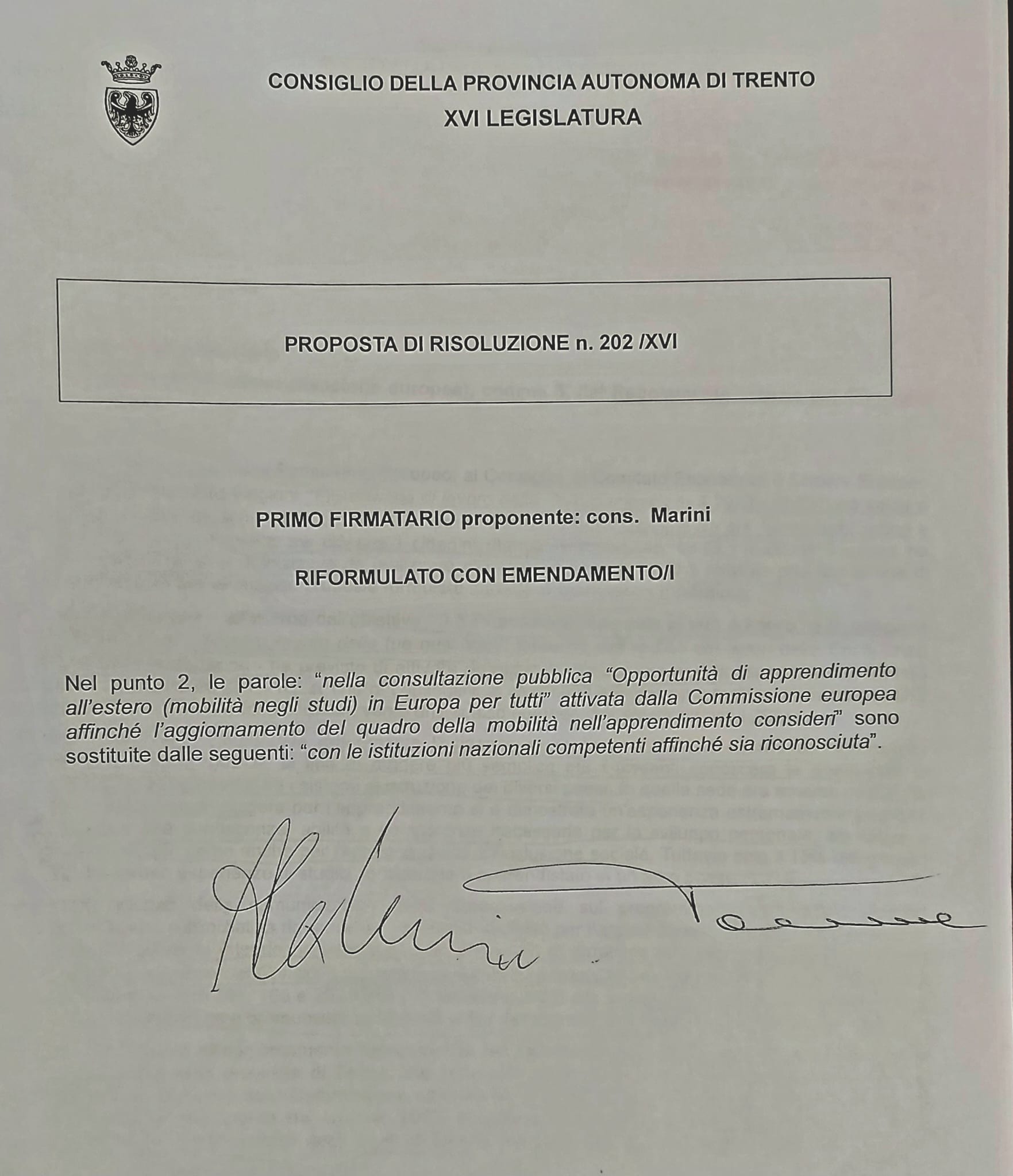 Segue il video della presentazione della risoluzione e il testo della proposta di risoluzione n. 202/XVI “Riconoscimento di titoli di studio a livello europeo” presentata il 28 marzo 2023 ai sensi dell’art. 150ter (Sessione europea), comma 3, del Regolamento interno del Consiglio provinciale (approvata con emendamento il 7 giugno 2023 e convertita nella risoluzione 126/XVI):