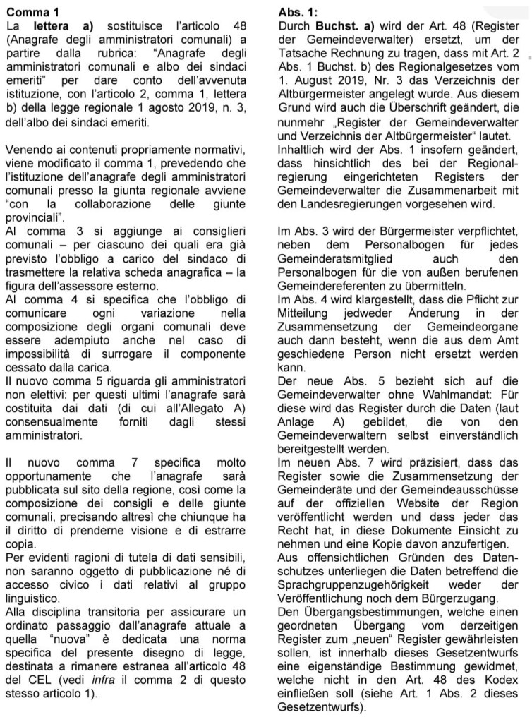 Tutto questo impegno ha trovato compimento di recente. Negli adeguamenti al Codice proposti con il disegno di legge regionale 64/XVI di iniziativa giuntale (relazione su lavori di commissione) è stata inserita anche una rivisitazione dell’articolo 48 che disciplina appunto l’anagrafe degli amministratori locali prevedendo espressamente l’obbligo di pubblicazione dello stesso e un maggiore coordinamento con le Province nell’aggiornamento dei dati. La nuova norma è stata perfezionata con un emendamento a mia prima firma e cofirmato con l’assessore agli enti locali Ossanna con cui è stata inserita anche la specifica del titolo di studio nella scheda anagrafica che ogni amministratore dovrà compilare assumerà efficacia a partire dal 2024.