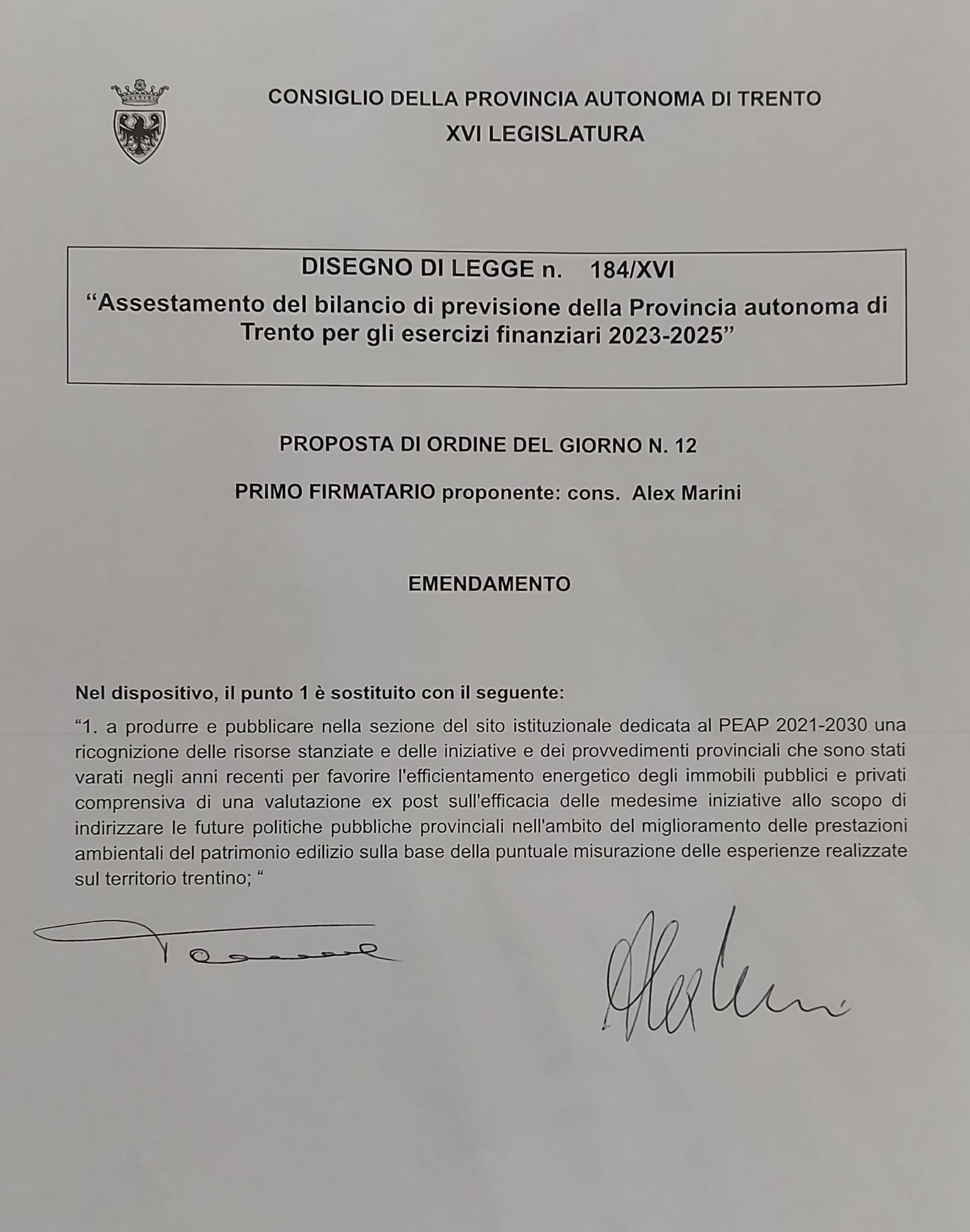 Proposta di ordine del giorno n.12/184-185/XVI del 27 luglio 2023 “Aggiornamento delle azioni della linea strategica 1 del PEAP 2021-2030, predisposizione di un programma di interventi finanziari e di revisione normativa e altre misure per favorire l’efficientamento energetico degli immobili pubblici e privati” collegata ai disegni di legge n. 184/XVI “Assestamento del bilancio di previsione della Provincia autonoma di Trento per gli esercizi finanziari 2023 – 2025” e n. 185/XVI “Bilancio di previsione della Provincia autonoma di Trento per gli esercizi finanziari 2024 – 2026” (Proposta approvata il 26 luglio 2023 con un emendamento che riformula il punto 1 e il respingimento dei punti 2 e 3 del dispositivo – CONVERTITA NELL’ORDINE DEL GIORNO 650/XVI)
