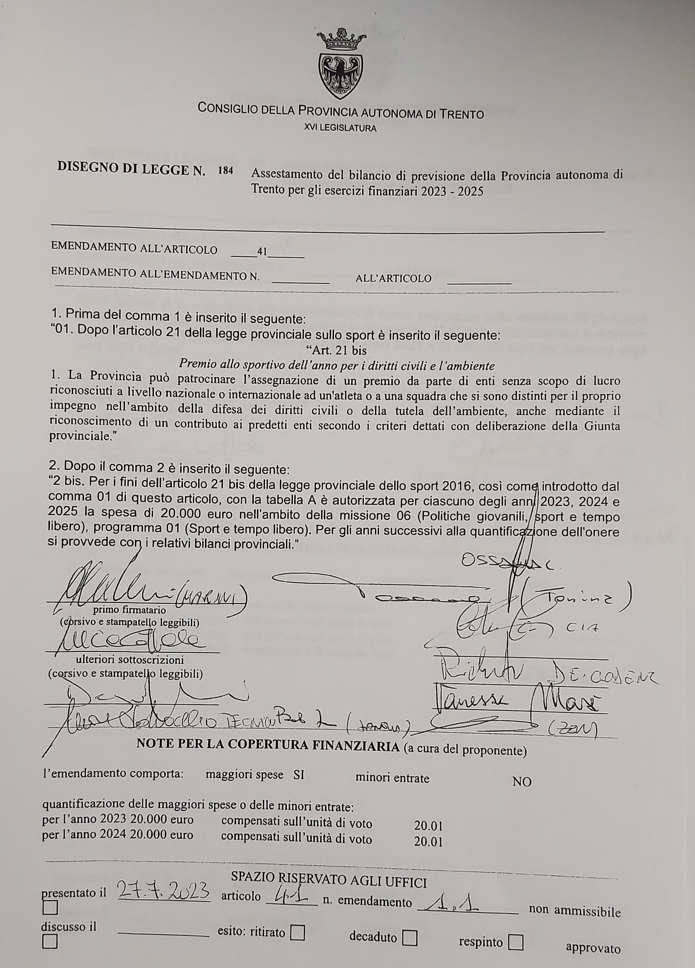 Approvato anche l’emendamento alla legge provinciale sullo sport 41.1 che riformula l’emendamento 4.1 inizialmente proposto per istituire il Premio allo sportivo dell’anno per i diritti civili e l’ambiente