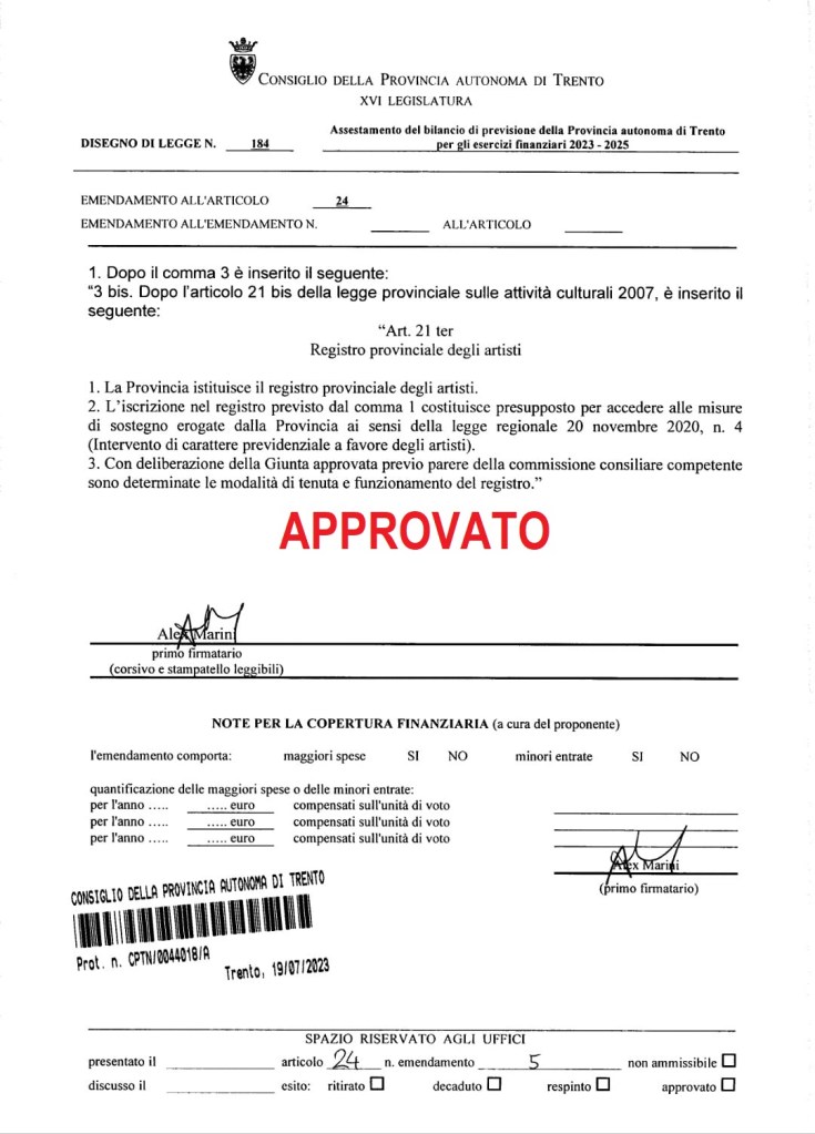 Anche in Trentino arriva il Registro provinciale degli artisti. Prendendo spunto da una legge già presente in l’Alto Adige / Südtirol, il Consigliere provinciale del M5S, Alex Marini, ha ottenuto l’approvazione di un emendamento all’assestamento di bilancio provinciale (nel dettaglio: è stato introdotto l’articolo 21 ter nella legge provinciale sulle attività culturali) tramite il quale viene prevista l’istituzione di un apposito registro provinciale al fine di consentire agli iscritti l’accesso ai fondi stanziati dalla legge regionale n.4 del 2020 che disciplina gli interventi di carattere previdenziale a favore degli artisti.