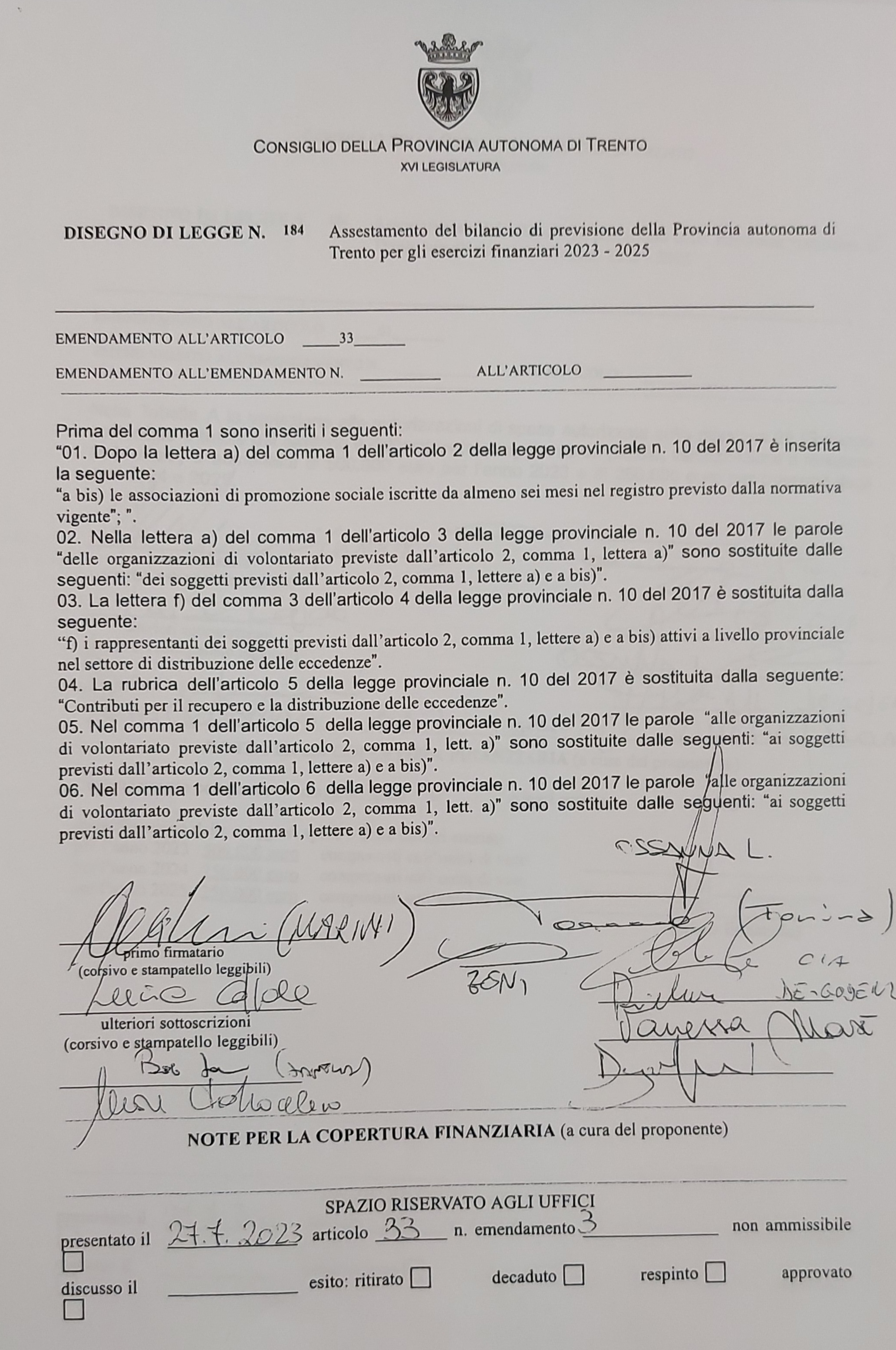 Recepito con una riformulazione concordata con la Giunta l’emendamento proposto dal M5S per riconoscere il diritto alle associazioni di promozione sociale, in aggiunta alle organizzazioni di volontariato, di poter contribuire all’attuazione delle finalità della legge provinciale 10 del 2017 promuovendo il recupero e la distribuzione di eccedenze alimentari, il consumo responsabile come strumento di riduzione degli sprechi alimentari e non alimentari, le iniziative per orientare alla salute alimentare anche gli interventi di solidarietà sociale e la riduzione della produzione di rifiuti.