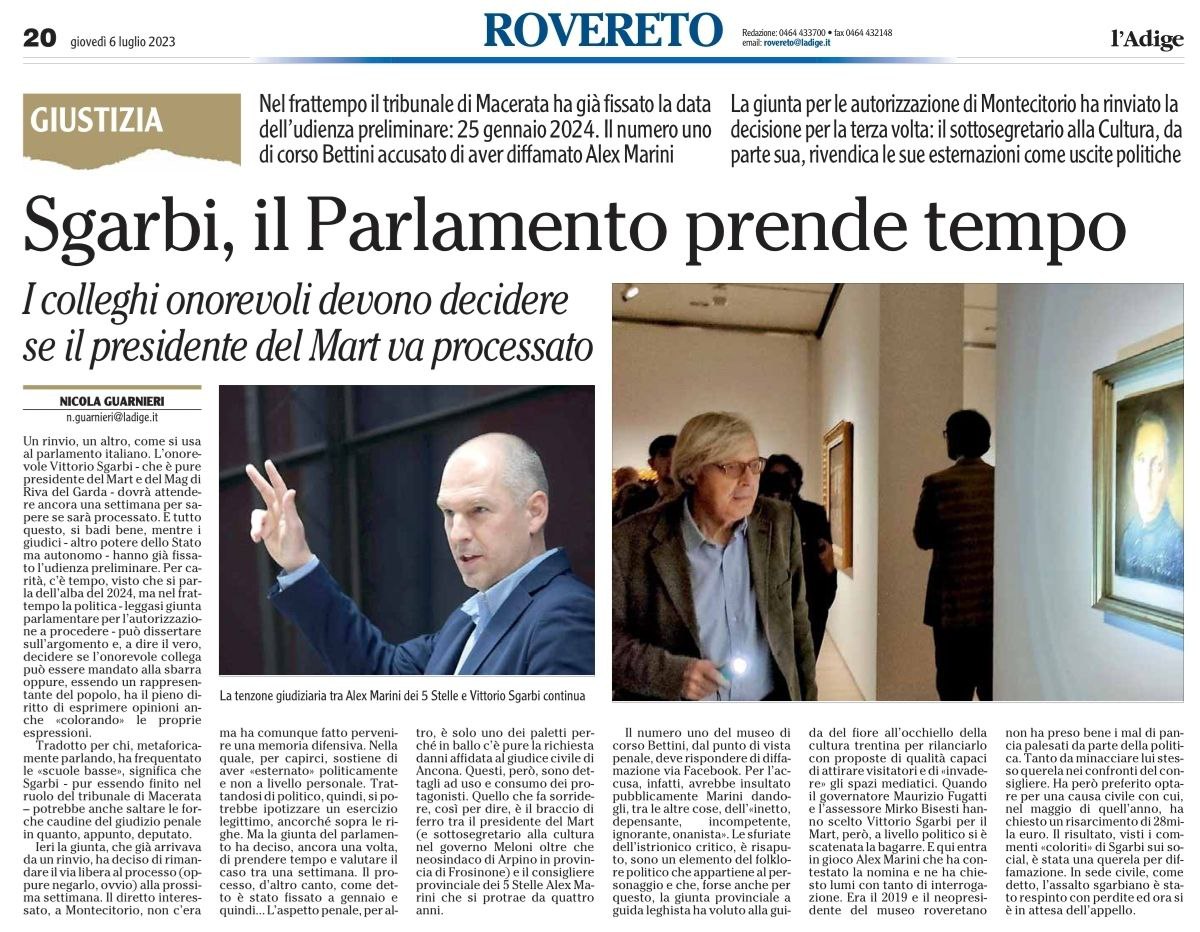 Novità anche sulla vicenda del presidente del Mart e ora sottosegretario alla cultura Vittorio Sgarbi: la Giunta per le Autorizzazioni della Camera dei Deputati il 25 luglio si è espressa sulla richiesta di insindacabilità avanzata da Sgarbi rispetto alla sentenza del Tribunale di Macerata, che lo aveva condannato al pagamento di un risarcimento nei miei confronti e alla rifusione delle spese legale (Il Resto del Carlino). La Giunta si era riunita precedentemente il 5 luglio (qui la cronaca di Nicola Guarnieri su L’Adige) e il 18 luglio nel definire l’istruttoria per la difesa d’ufficio di Sgarbi al fine di favorire la disapplicazione dei meccanismi della giustizia nei confronti dell’ex deputato.