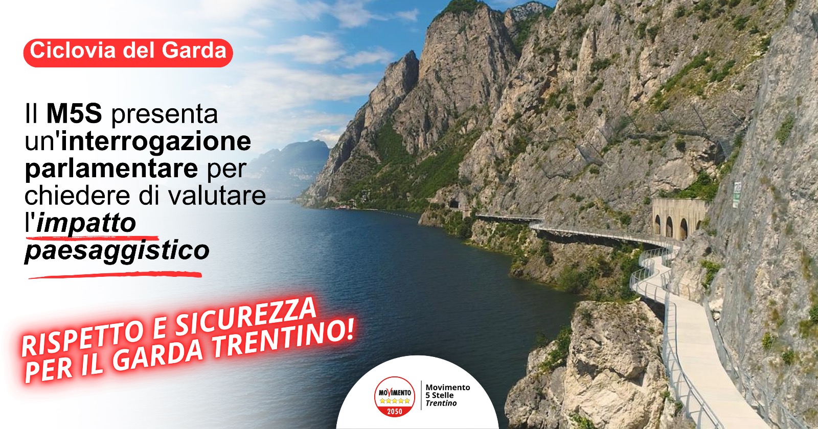 La ciclovia del Garda è un’opera importante e potenzialmente utile, che però deve essere realizzata nel rispetto dei meravigliosi territori che la ospitano e garantendo la sicurezza di chi la percorre. Condizioni che rischiano di non essere rispettate dalle attuali progettazioni promosse dal governo di Giorgia Meloni e da quello provinciale di Maurizio Fugatti. Il … Continua a leggere Ciclovia del Garda. Il M5S presenta un’interrogazione parlamentare per chiedere di valutare l’impatto paesaggistico