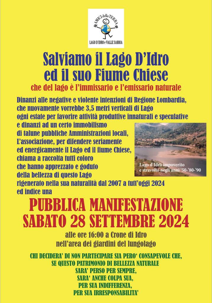 - 16-set-2024 Appello a partecipare alla Manifestazione popolare del 28 settembre per la difesa del lago d’Idro che si svolgerà a Crone di Idro da parte del Presidente dell’Associazione Amici della Terra Lago d’Idro e Valle Sabbia
