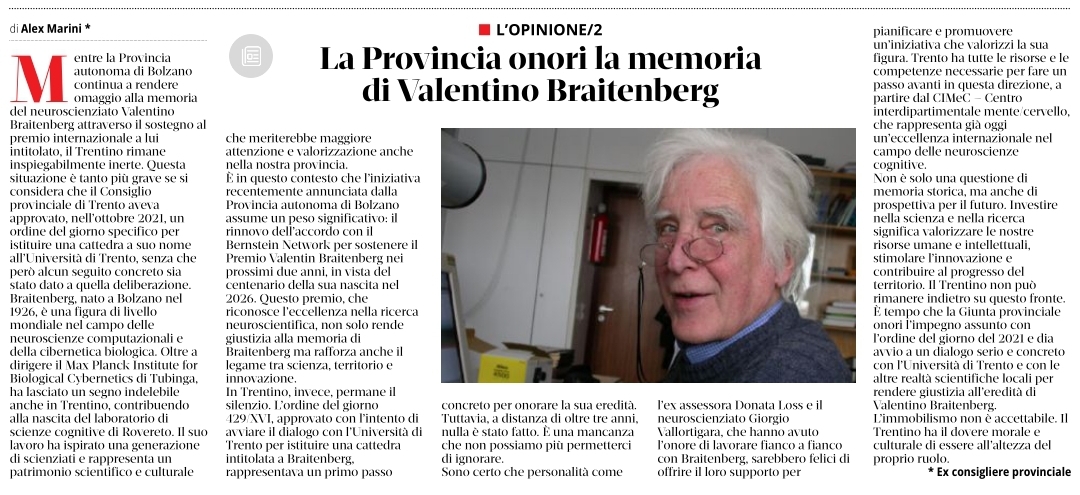 Mentre la Provincia autonoma di Bolzano continua a rendere omaggio alla memoria del neuroscienziato Valentino Braitenberg attraverso il sostegno al premio internazionale a lui intitolato, il Trentino rimane inspiegabilmente inerte. Questa situazione è tanto più grave se si considera che il Consiglio provinciale di Trento aveva approvato, nell’ottobre 2021, un ordine del giorno specifico per istituire una cattedra a suo nome presso l’Università di Trento, senza che però alcun seguito concreto sia stato dato a quella deliberazione.