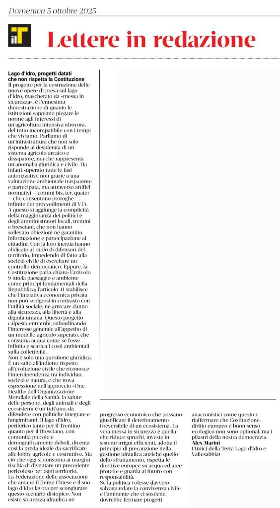 Il lago d’Idro, periferico tanto per il Trentino quanto per il Bresciano, con comunità piccole e demograficamente deboli, diventa così la preda ideale da sacrificare alle lobby agricole e costruttive. Ma ciò che oggi si consuma ai margini rischia di diventare un precedente pericoloso per ogni territorio.