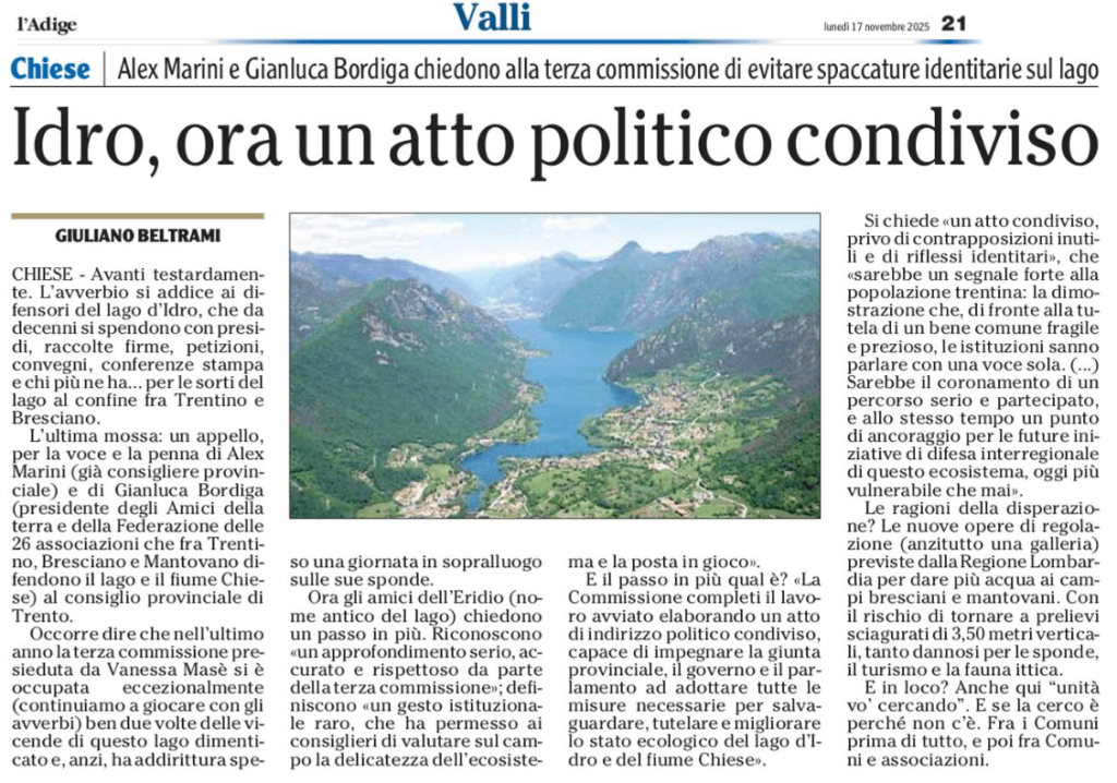 Con questo appello chiediamo che la Commissione — e poi il Consiglio — possano esprimere una posizione unitaria e lungimirante, all’altezza della responsabilità istituzionale e del legame che unisce le nostre comunità al lago d’Idro e al fiume Chiese. Sarebbe il coronamento di un percorso serio e partecipato, e allo stesso tempo un punto di ancoraggio per le future iniziative di difesa interregionale di questo ecosistema, oggi più vulnerabile che mai.