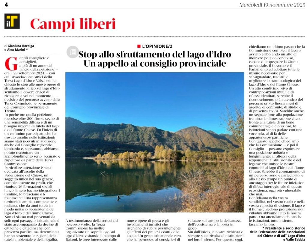Si tratta di un testo sostenuto dall’intera Federazione del Chiese — 26 realtà sociali di tre province, tra cui l’associazione Amici della Terra Lago d’Idro e Valle Sabbia che ha promosso la petizione — che da anni lavora con competenza e ostinazione per la tutela del lago e del fiume.