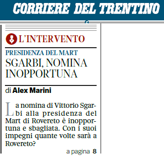 Sgarbi è un critico d’arte ed un politico in attività che ricopre il ruolo di parlamentare e di sindaco della cittadina laziale di Sutri. Questi impegni da soli avrebbero dovuto sconsigliare la sua nomina. Quando mai troverà il tempo di partecipare alla vita del museo se non nelle occasioni di gala? A Fugatti importa che il presidente sia presente a Rovereto? Continua a leggere “La nomina di Vittorio Sgarbi alla presidenza del Mart è inopportuna e sbagliata”