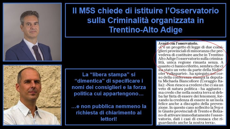 L’11 maggio 2022 il quotidiano l’Adige pubblicava un articolo in cui si faceva riferimento alla proposta di legge presentata dal M5S per istituire anche nella nostra Regione un Osservatorio sulla Criminalità organizzata. Stranamente l’autore del pezzo non specificava né quale forza politica avesse avanzato la proposta e nemmeno i nomi dei due misteriosi consiglieri citati nel testo.
