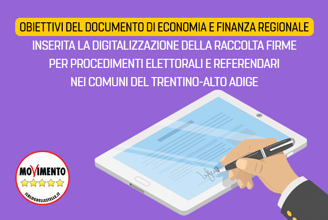 Nel giugno scorso il M5S aveva presentato al Consiglio regionale una serie di proposte sotto forma di ordini del giorno e di emendamenti per rimediare ad alcune gravi carenze nell’ambito dei procedimenti referendari ed elettorali che sono in contrasto con i principi del diritto internazionale e che vanno superate non solo a livello nazionale ma anche locale. Oltre alle procedure di autenticazione delle firme e di voto avevamo elaborato delle proposte per digitalizzare le modalità di raccolta delle firme per i referendum e per la presentazione delle candidature nei comuni della regione Trentino-Alto Adige/Südtirol ma queste erano state inesorabilmente bocciate. La scelta della maggioranza era stata quella di non considerare le misure non strettamente correlate all’emergenza Covid-19. Ora però le idee che abbiamo seminato stanno germogliando a dimostrazione della loro bontà. Continua a leggere “Grazie al M5S la digitalizzazione del sistema di raccolta delle firme è stata inserita tra gli obiettivi strategici del Documento di Economia e Finanza regionale”