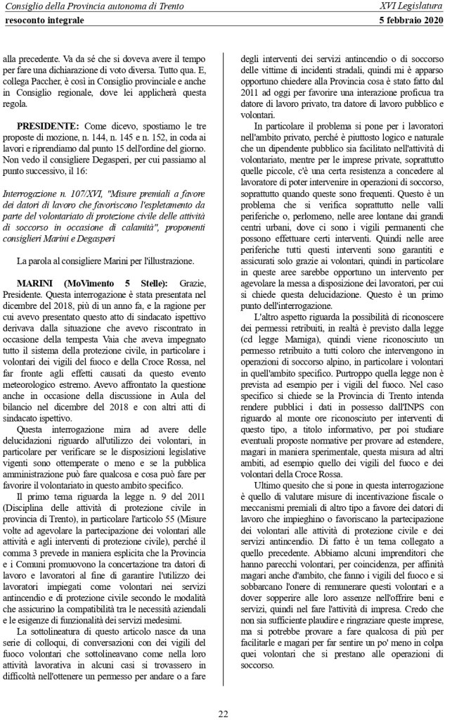 5 febbraio 2020 – In mancanza di risposte l’interrogazione 107 viene trasformata in interrogazione a risposta orale (pdf resoconto risposta):